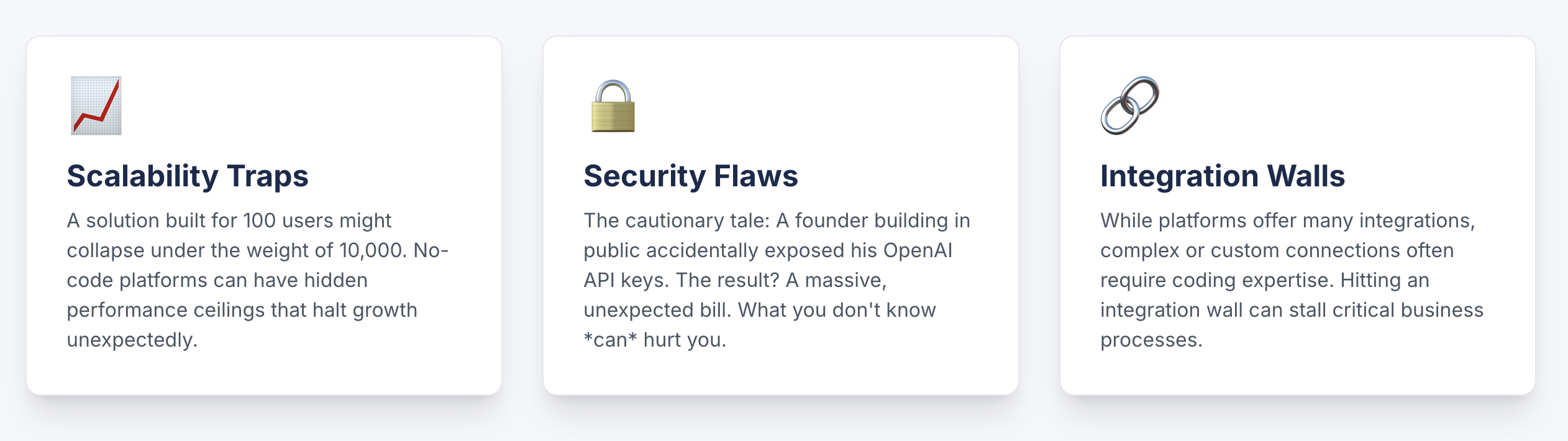Okay, let's assume you've already created a solution using these no-code platforms. How do you know what mistakes might have been made? If you don't have a technical background, you probably aren't even aware of the limitations of these tools.